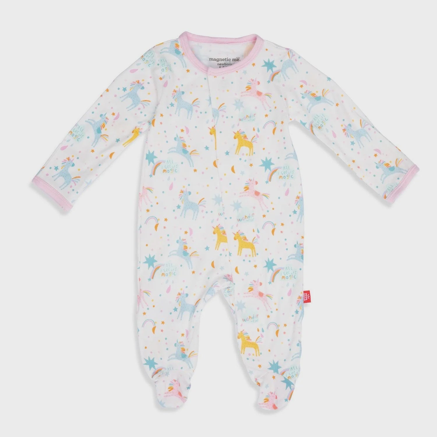 - magnetic closures: magnets line the seam from the neck to upper thigh for sizes up to 0-3m & from neck to crotch for sizes 3-6m and up.