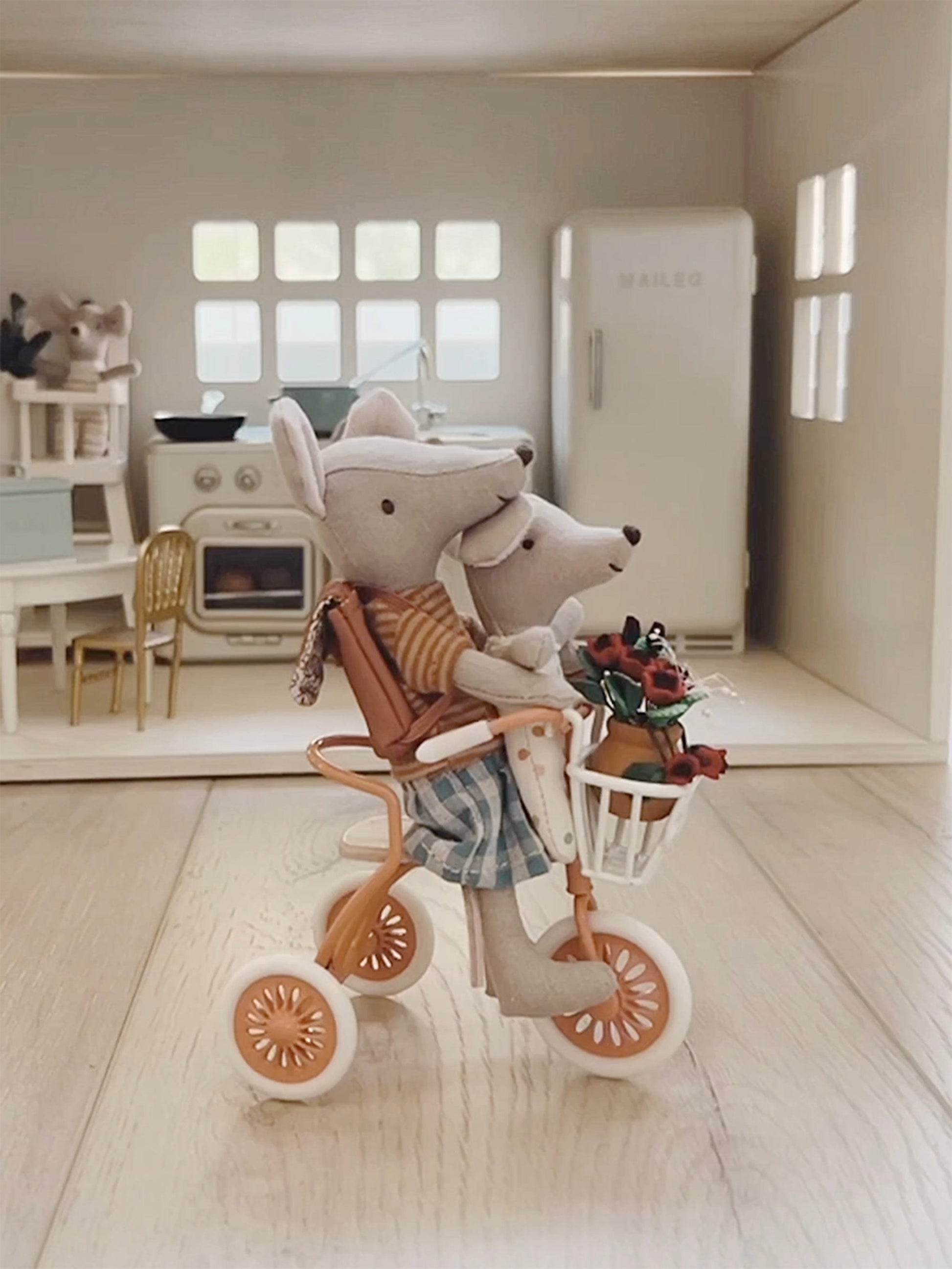 This tricycle comes in a garage box and is designed for big brother and big sister mice.