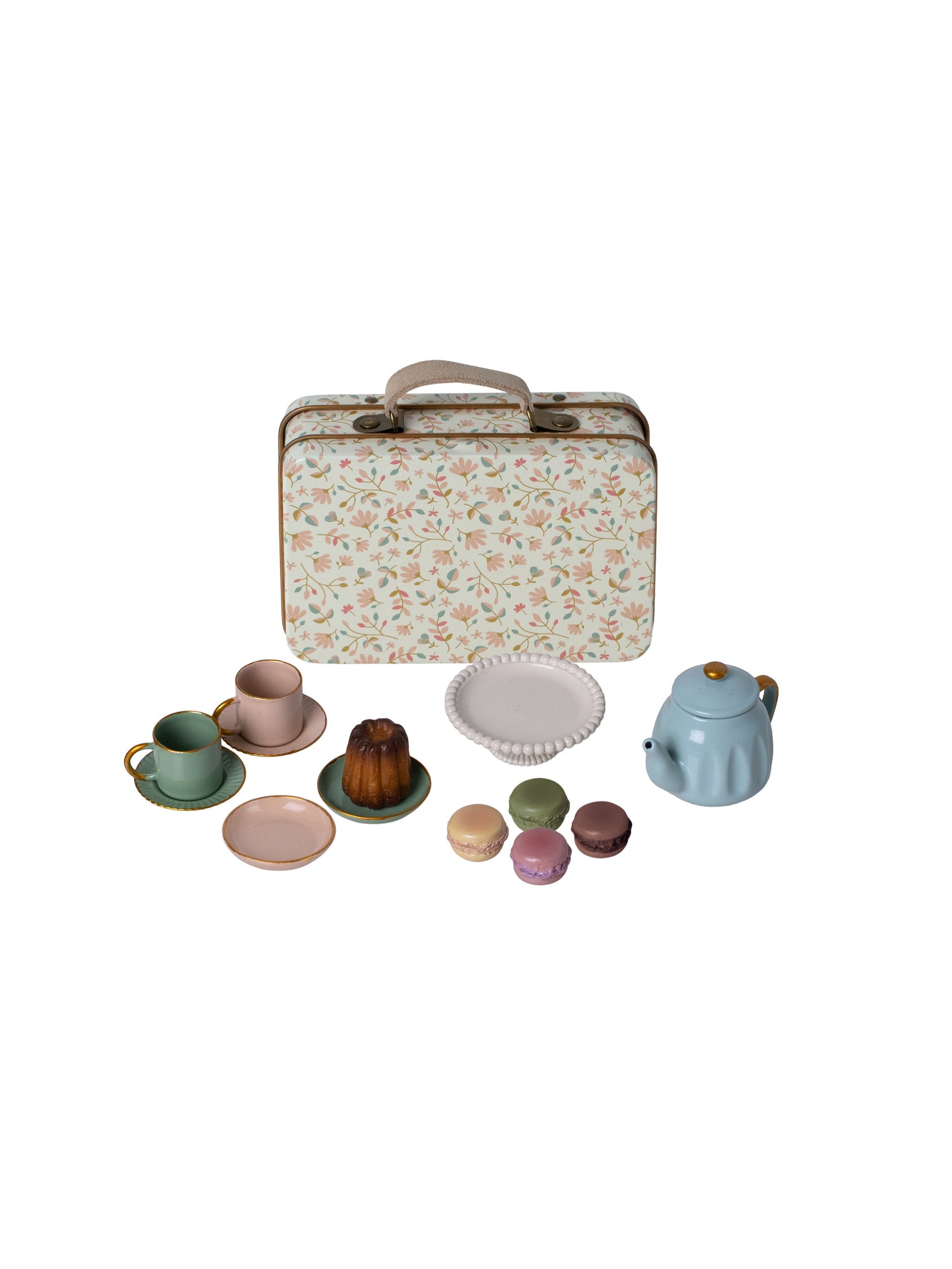 This tea set is the perfect size for a mouse paw. Each set includes all you need for a cosy moment with tea, cakes and tableware. It comes in a metal suitcase, lovely decorated with Maileg print.