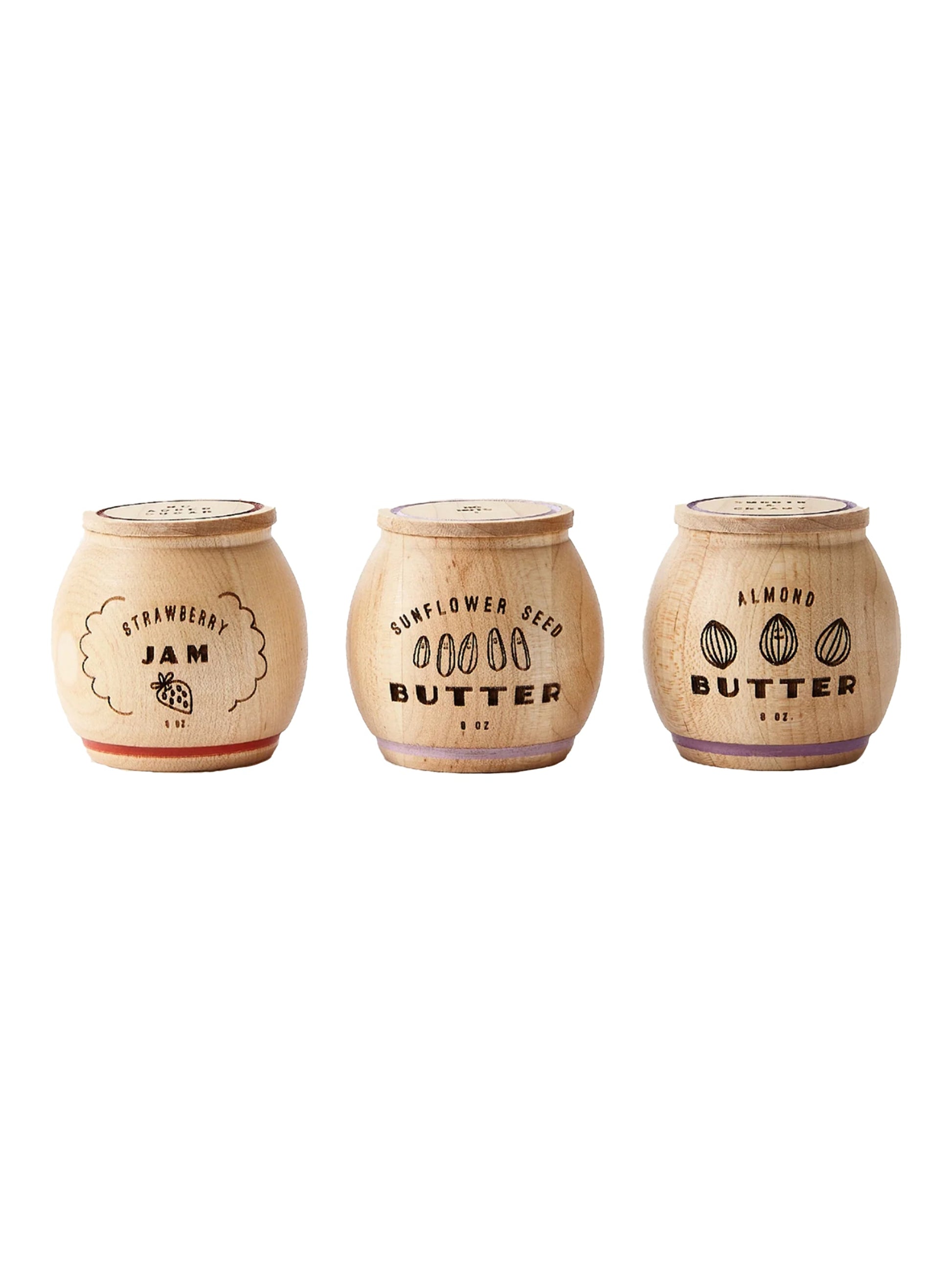 Modern essentials for kitchen play that includes heirloom quality wooden jars that open. No peanuts? No problem! This set includes jars of alternative butter and jam jars that open for even more interactive fun.