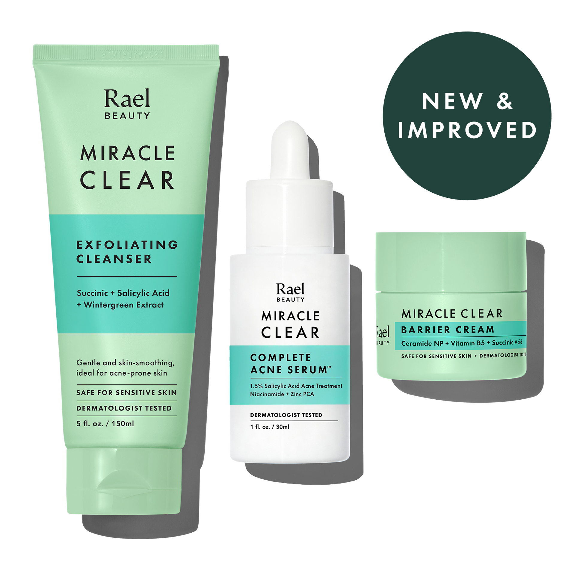 Meet the NEW Miracle Clear Trio, three simple daily steps to clearer and healthier skin. The Exfoliating Cleanser gently washes away buildup and excess oil, while the Complete Acne Serum is a treatment designed to target acne in all stages. Finish with the Barrier Cream to restore the skin barrier, preventing future breakouts. Perfect for sensitive, oily, acne-prone skin, as well as for those with large or clogged pores. Dermatologist tested.