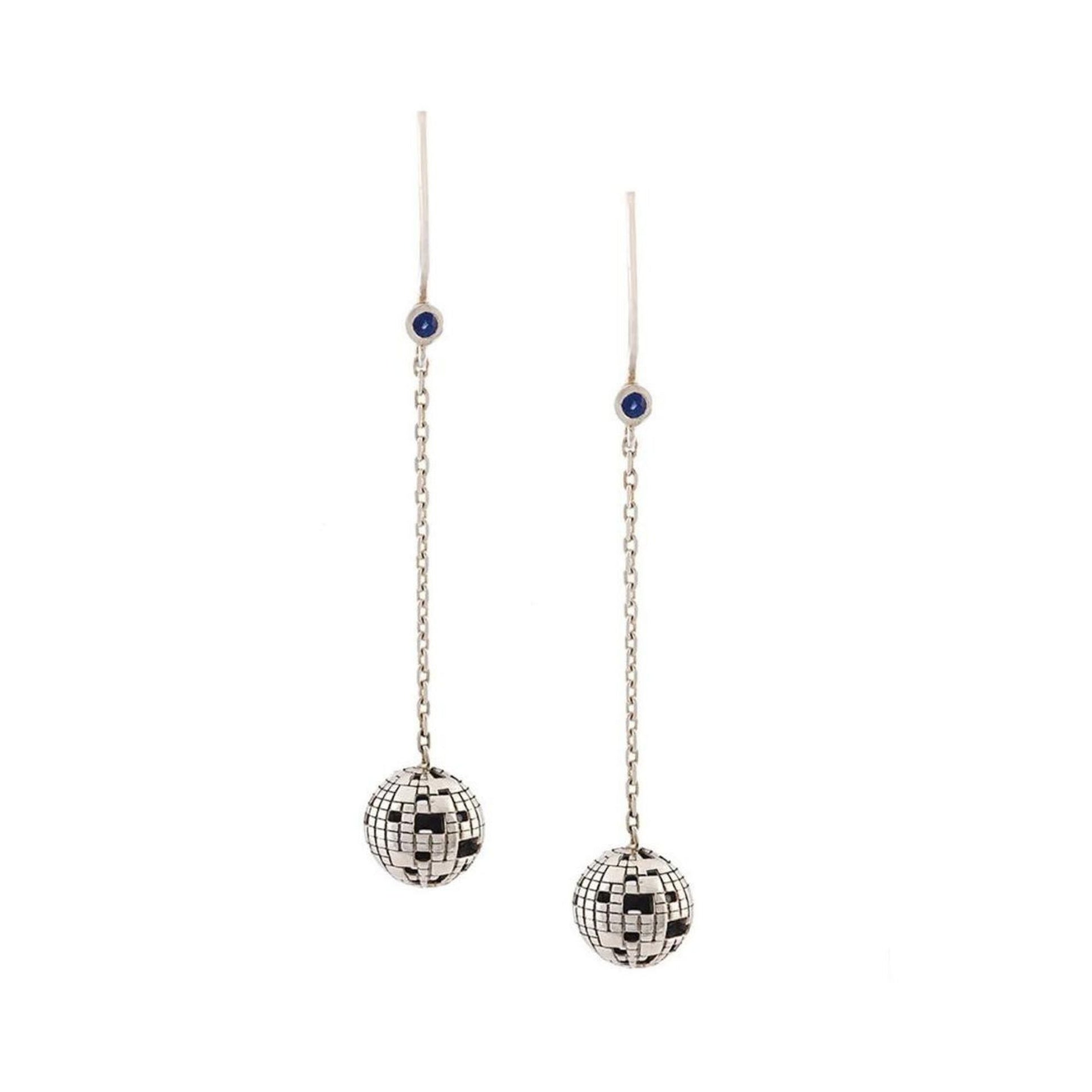 Sterling silver hanging globe earrings with a blue round cut sapphire in a tube setting at 2.2mm and a dangling fractured globe.?