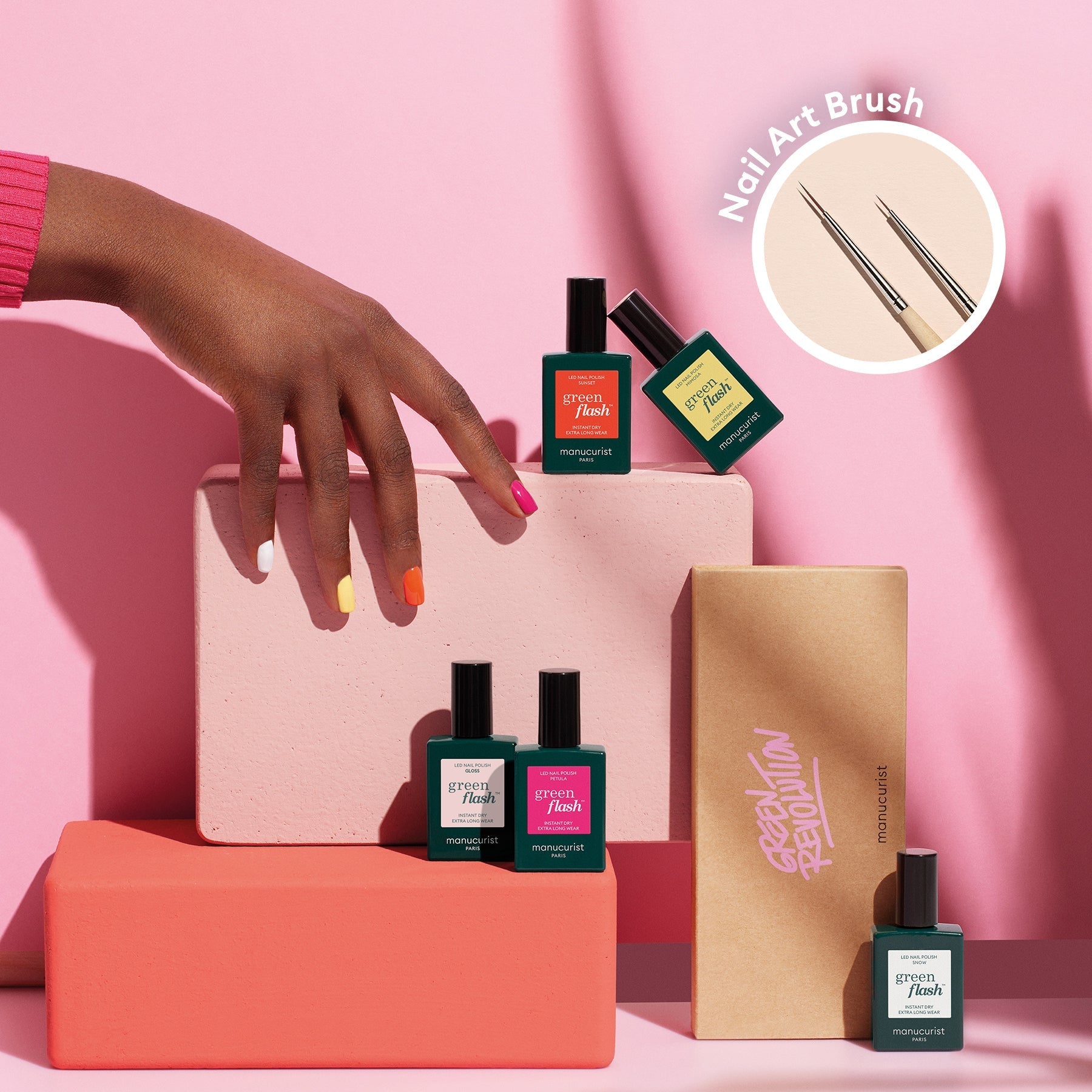 Brushes at the ready! This set contains all the products you need to create the iconic summer nail art in our Yucatàn collection: 5 Green Flash? or Green colors (Pétula, Gloss, Sunset, Mimosa, Snow) + 1 Nail Art Brush.