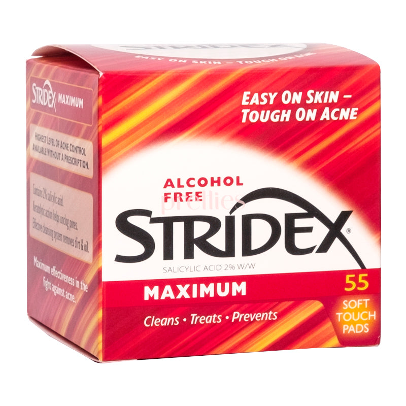 Stridex Maximum Pads have the highest level of acne-fighting medicine allowed (2% salicylic acid) without a prescription, and are recommended for cases of moderate acne. Maximum Pads contain effective skin cleansers that work to remove dirt, oil, sweat and other impurities from the surface of the skin, penetrate to unclog pores, and dissolve deep down oil